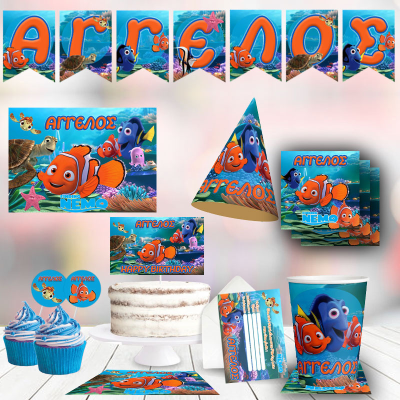 Ένα ολοκληρωμένο σετ πάρτυ με το Nemo, μπορείς να γράψεις το όνομα σου, επάνω σε όλα τα προϊόντα του σετ.