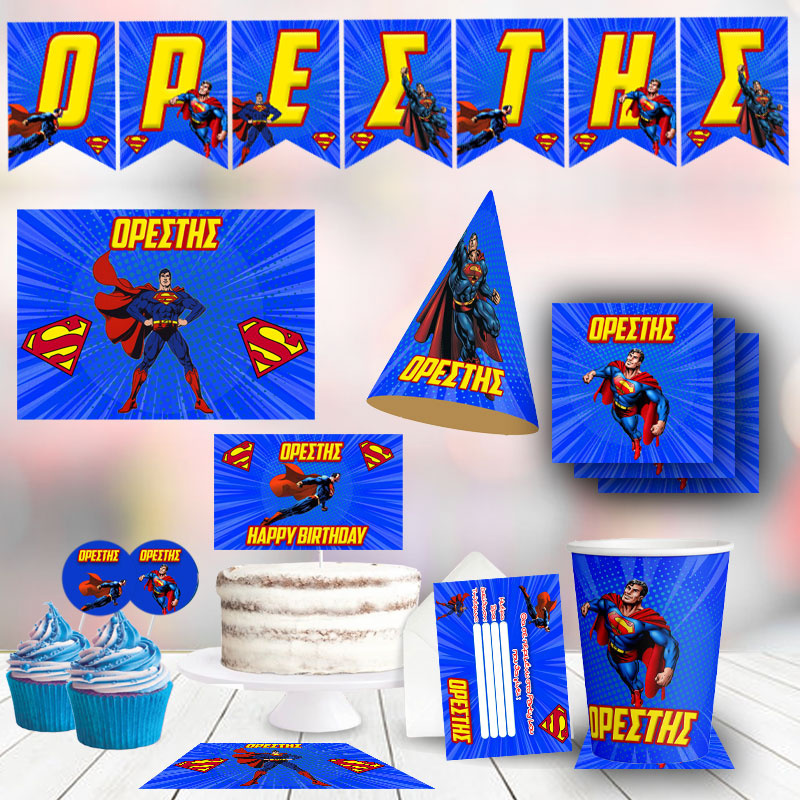 Ένα ολοκληρωμένο σετ πάρτυ με τον Superman, μπορείς να γράψεις το όνομα σου, επάνω σε όλα τα προϊόντα του σετ.