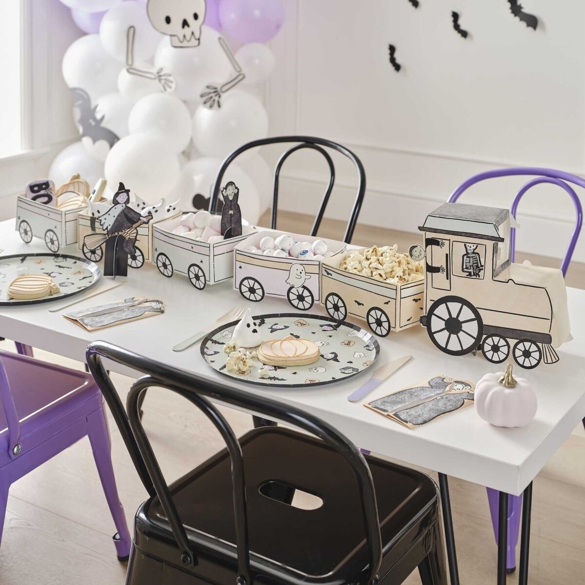 Προσθέστε την τελική πινελιά στο τραπέζι του Halloween πάρτι σας με αυτό το τρένο των φαντασμάτων γεμάτο με τα αγαπημένα σας… τρομακτικά γλυκά και τις 3D φιγούρες. Κάθε πακέτο περιέχει: