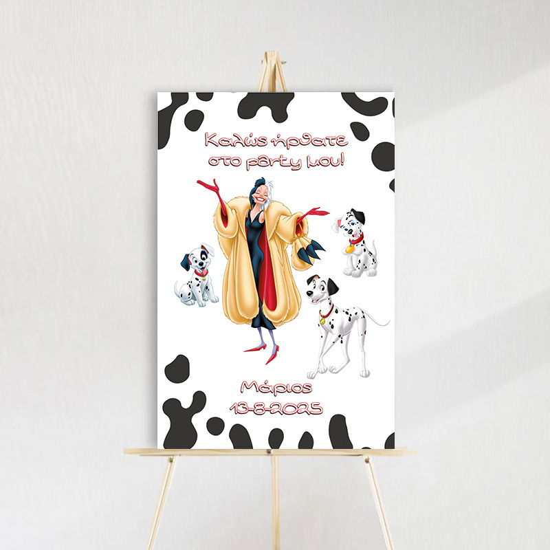 Ταμπέλα Πάρτυ με θέμα 101 Σκυλάκια Δαλματίας, φτιαγμένη από ξύλο, διαστάσεων 60x40cm. Προσθέστε μια μαγική πινελιά στo party του παιδιού σας με αυτή την όμορφη και μοναδική διακόσμηση.