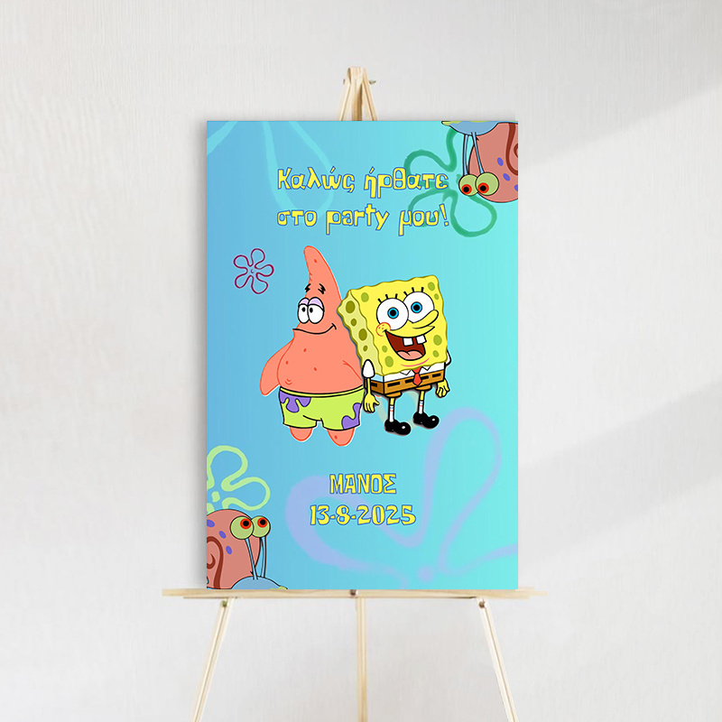 Ταμπέλα Πάρτυ με θέμα Μπομπ Σφουγγαράκης, φτιαγμένη από ξύλο, διαστάσεων 60x40cm. Προσθέστε μια μαγική πινελιά στo party του παιδιού σας με αυτή την όμορφη και μοναδική διακόσμηση.