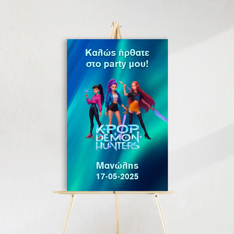 Ταμπέλα Πάρτυ με θέμα K-Pop Demon Hunters, φτιαγμένη από ξύλο, διαστάσεων 60x40cm. Προσθέστε μια μαγική πινελιά στo party του παιδιού σας με αυτή την όμορφη και μοναδική διακόσμηση.