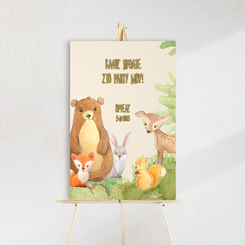 Ταμπέλα Πάρτυ με θέμα τα Ζώα του Δάσους, φτιαγμένη από ξύλο, διαστάσεων 60x40cm. Προσθέστε μια μαγική πινελιά στo party του παιδιού σας με αυτή την όμορφη και μοναδική διακόσμηση.