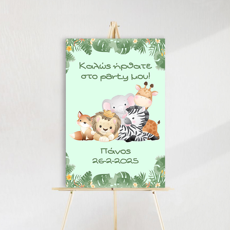 Ταμπέλα Πάρτυ με θέμα Ζωάκια Ζούγκλας, φτιαγμένη από ξύλο, διαστάσεων 60x40cm. Προσθέστε μια μαγική πινελιά στo party του παιδιού σας με αυτή την όμορφη και μοναδική διακόσμηση.