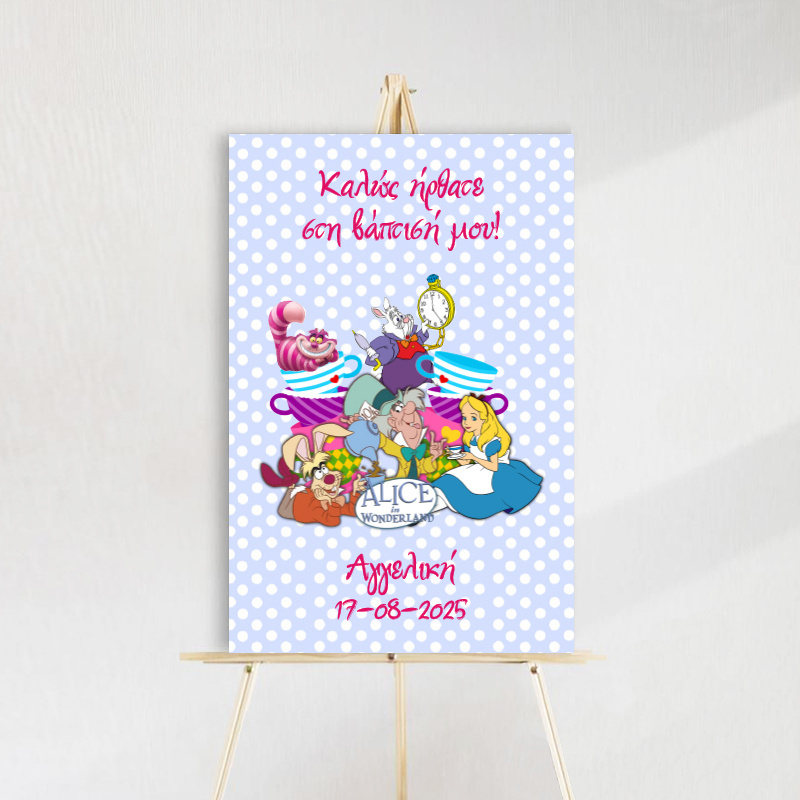 Ταμπέλα βάπτισης με θέμα Βάπτιση Αλίκη στη Χώρα των Θαυμάτων, φτιαγμένη από ξύλο, διαστάσεων 60x40cm. Προσθέστε μια μαγική πινελιά στην βάπτιση του παιδιού σας με αυτή την όμορφη και μοναδική διακόσμηση.