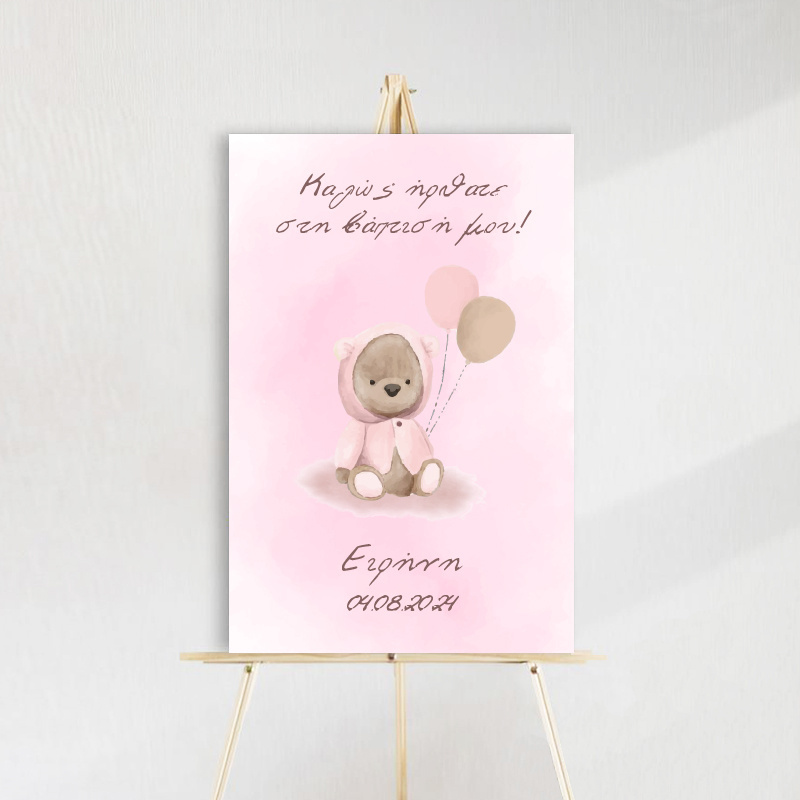 Ταμπέλα βάπτισης με θέμα Αρκουδάκι για Κορίτσι, φτιαγμένη από ξύλο, διαστάσεων 60x40cm. Προσθέστε μια μαγική πινελιά στην βάπτιση του παιδιού σας με αυτή την όμορφη και μοναδική διακόσμηση.