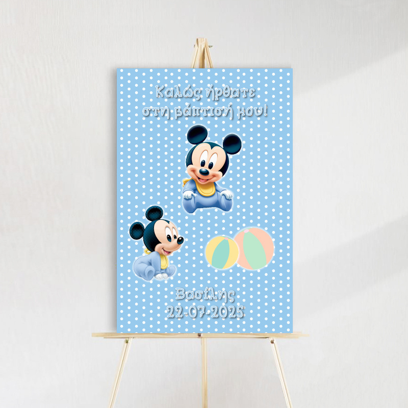 Ταμπέλα βάπτισης με θέμα Baby Mickey, φτιαγμένη από ξύλο, διαστάσεων 60x40cm. Προσθέστε μια μαγική πινελιά στην βάπτιση του παιδιού σας με αυτή την όμορφη και μοναδική διακόσμηση.