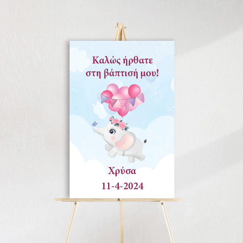 Ταμπέλα βάπτισης με θέμα Ελεφαντάκι για Κορίτσι, φτιαγμένη από ξύλο, διαστάσεων 60x40cm. Προσθέστε μια μαγική πινελιά στην βάπτιση του παιδιού σας με αυτή την όμορφη και μοναδική διακόσμηση.