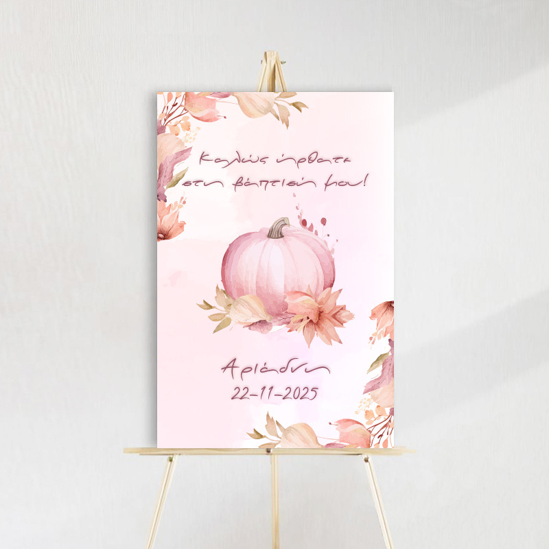 Ταμπέλα βάπτισης με θέμα Κολοκύθα, φτιαγμένη από ξύλο, διαστάσεων 60x40cm. Προσθέστε μια μαγική πινελιά στην βάπτιση του παιδιού σας με αυτή την όμορφη και μοναδική διακόσμηση.