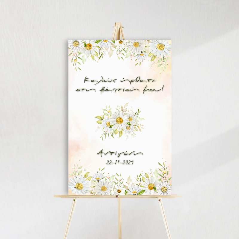 Ταμπέλα βάπτισης με θέμα Μαργαρίτα, φτιαγμένη από ξύλο, διαστάσεων 60x40cm. Προσθέστε μια μαγική πινελιά στην βάπτιση του παιδιού σας με αυτή την όμορφη και μοναδική διακόσμηση.