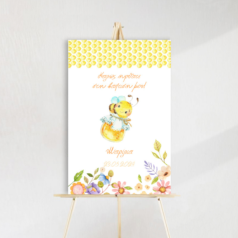 Ταμπέλα βάπτισης με θέμα Μέλισσα, φτιαγμένη από ξύλο, διαστάσεων 60x40cm. Προσθέστε μια μαγική πινελιά στην βάπτιση του παιδιού σας με αυτή την όμορφη και μοναδική διακόσμηση.