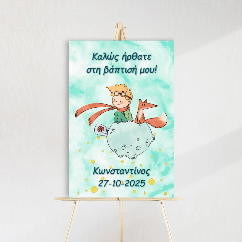 Ταμπέλα βάπτισης με θέμα Ο Μικρός Πρίγκιπας, φτιαγμένη από ξύλο, διαστάσεων 60x40cm. Προσθέστε μια μαγική πινελιά στην βάπτιση του παιδιού σας με αυτή την όμορφη και μοναδική διακόσμηση.