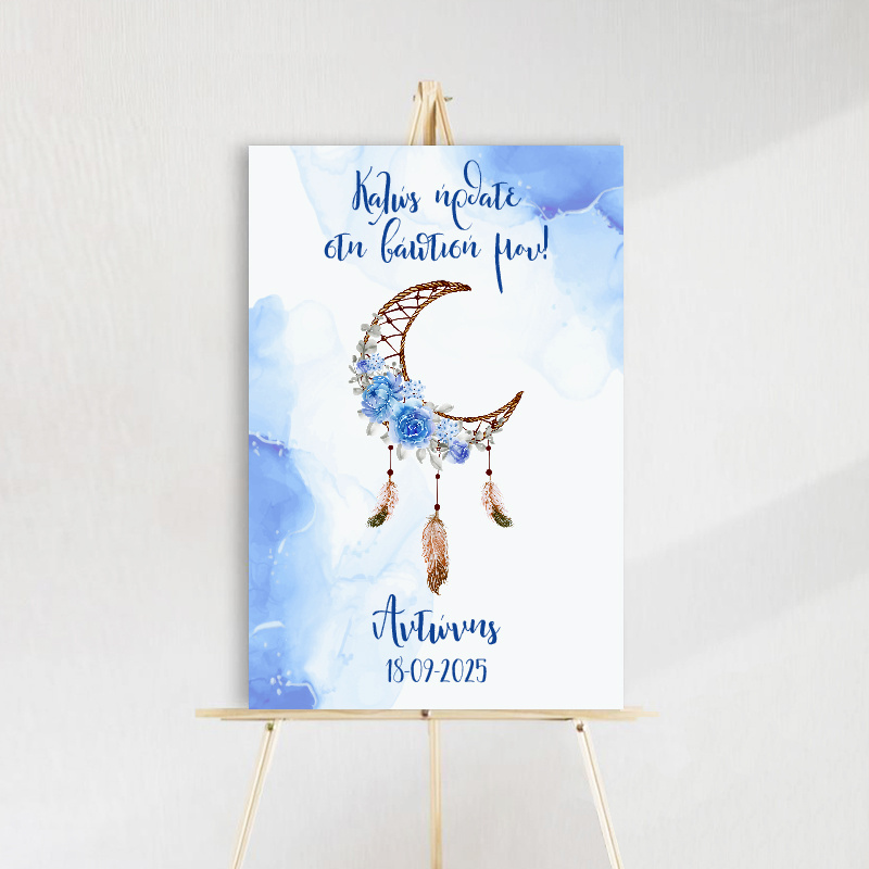 Ταμπέλα βάπτισης με θέμα Ονειροπαγίδα Αγόρι, φτιαγμένη από ξύλο, διαστάσεων 60x40cm. Προσθέστε μια μαγική πινελιά στην βάπτιση του παιδιού σας με αυτή την όμορφη και μοναδική διακόσμηση.