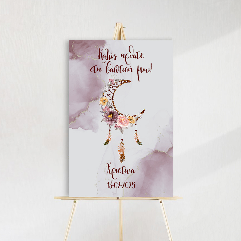 Ταμπέλα βάπτισης με θέμα Ονειροπαγίδα Κορίτσι, φτιαγμένη από ξύλο, διαστάσεων 60x40cm. Προσθέστε μια μαγική πινελιά στην βάπτιση του παιδιού σας με αυτή την όμορφη και μοναδική διακόσμηση.