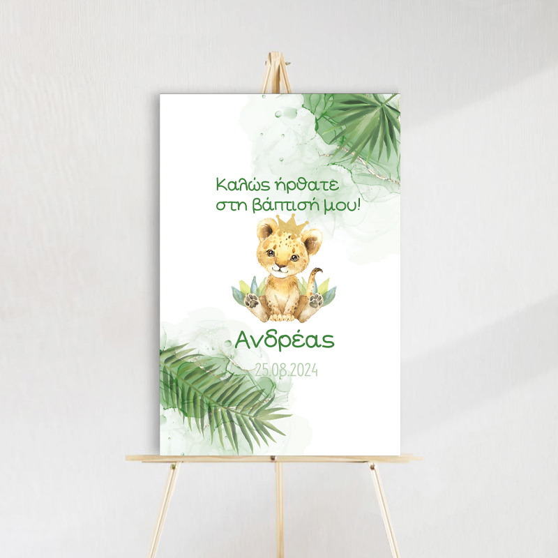 Ταμπέλα βάπτισης με θέμα Τιγράκι με Κορώνα, φτιαγμένη από ξύλο, διαστάσεων 60x40cm. Προσθέστε μια μαγική πινελιά στην βάπτιση του παιδιού σας με αυτή την όμορφη και μοναδική διακόσμηση.