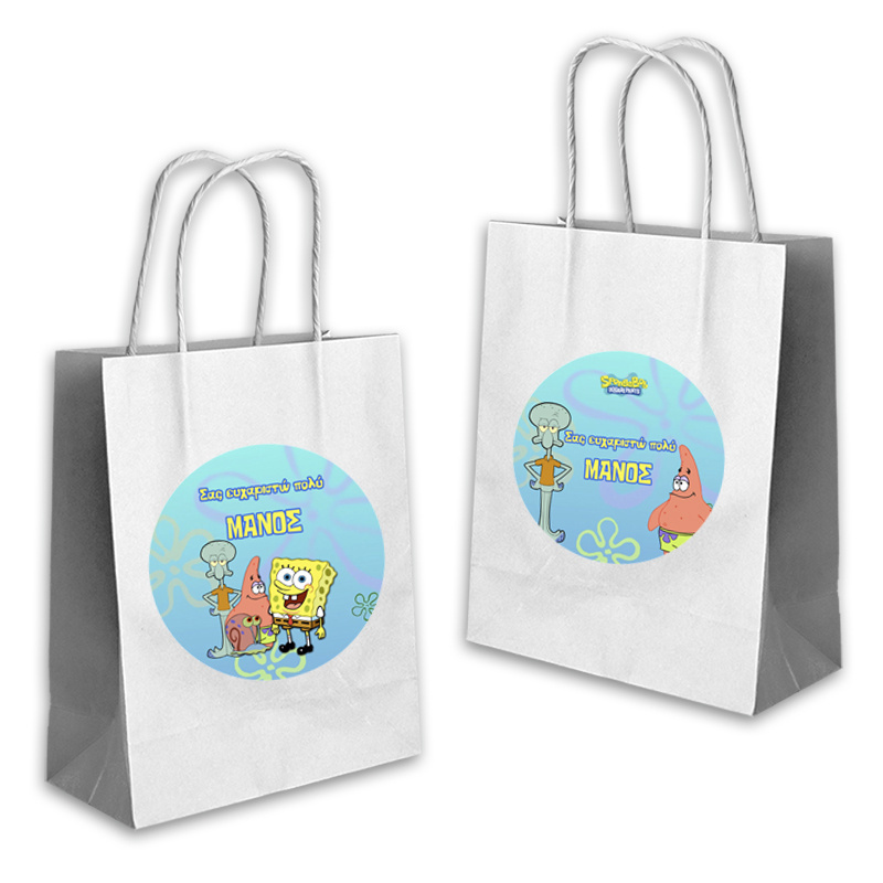 Ποιοτική τσάντα δώρου Μπομπ Σφουγγαράκης 22cmx18cmx8cm με το όνομα του παιδιού. Ιδανική για τα δώρα σας!(τιμή τεμαχίου).