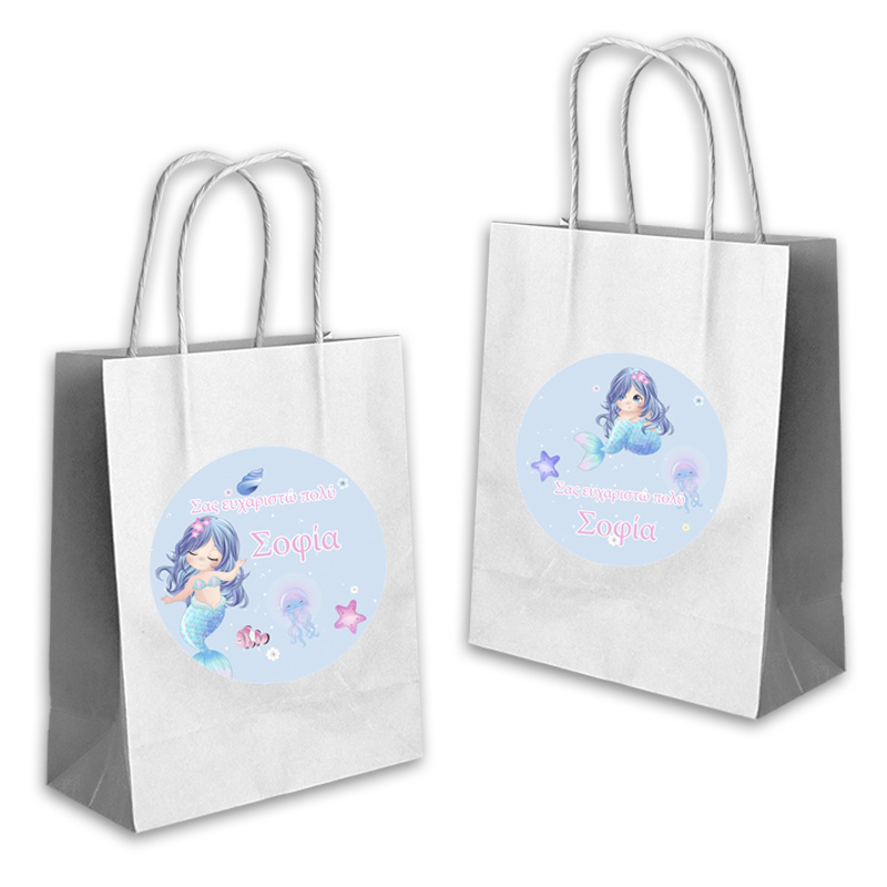 Ποιοτική τσάντα δώρου Γοργόνα 22cmx18cmx8cm με το όνομα του παιδιού. Ιδανική για τα δώρα σας!(τιμή τεμαχίου).