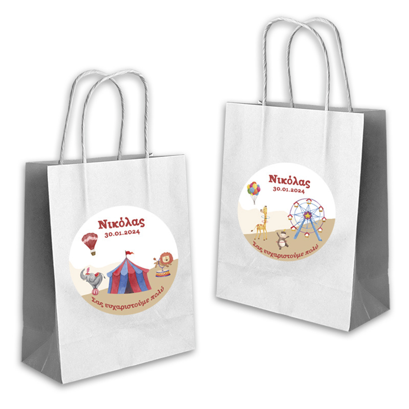 Ποιοτική τσάντα δώρου Τσίρκο 22cmx18cmx8cm με το όνομα του παιδιού. Ιδανική για τα δώρα σας!(τιμή τεμαχίου).
