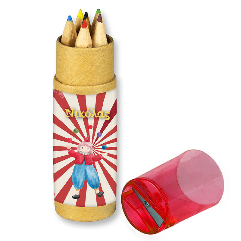 Σετ Ξυλομπογιές 6τμχ με ξύστρα Τσίρκο με όνομα ένα υπέροχο δωράκι για τους μικρούς μας φίλους. Για την Βάπτιση και το Πάρτι σας.