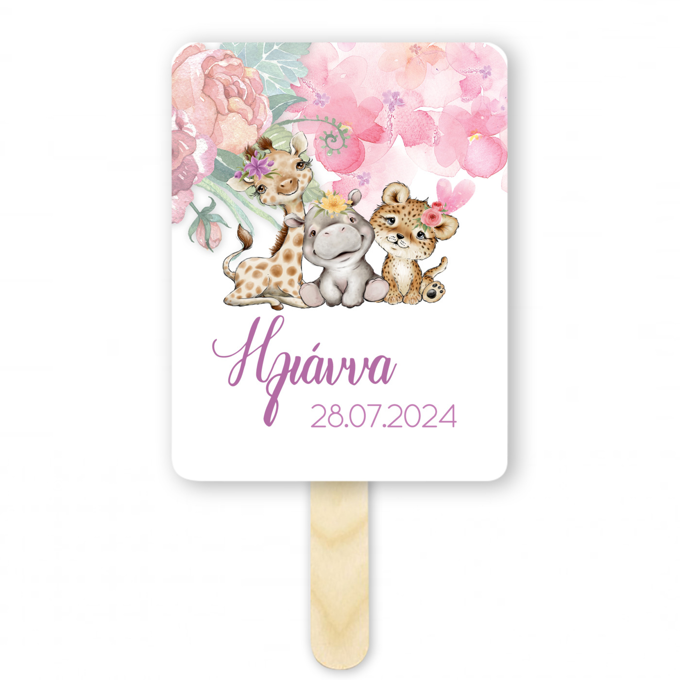 Εντυπωσιακή ορθογώνια χάρτινη βεντάλια με όνομα Ζωάκια ζούγκλας Κορίτσι, ένα έξυπνο αναμνηστικό δωράκι για τους καλεσμένους σας.