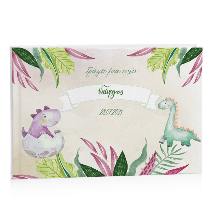 Bιβλίο ευχών με θέμα Baby Dino, είναι μια υπέροχη επιλογή για τη βάπτιση του μωρού σας.