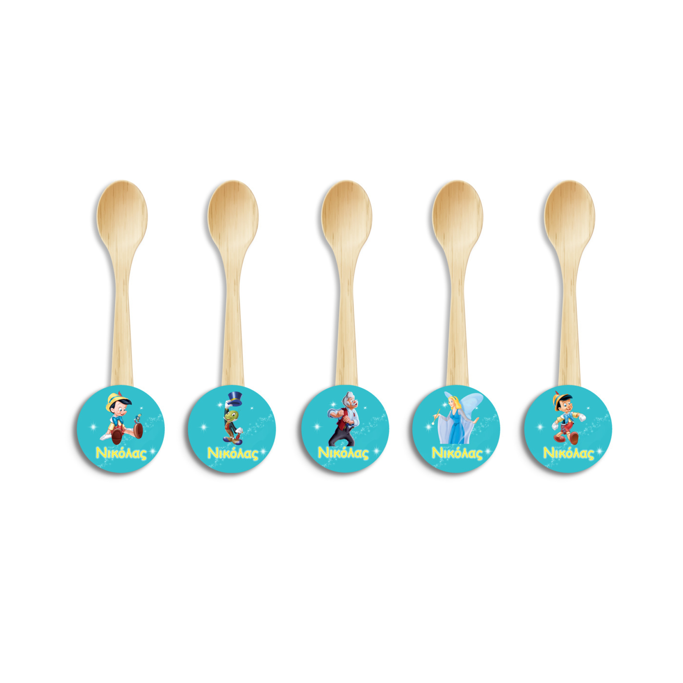 Ξύλινα Κουταλάκια με όνομα Πινόκιο για τον θεματικό μπουφέ σας.