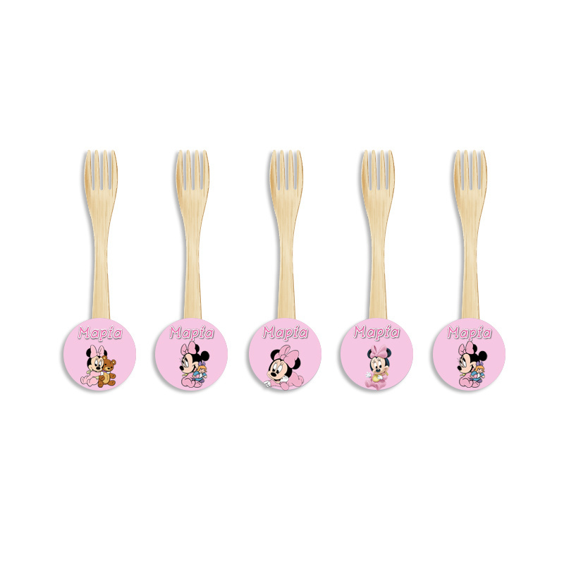 Ξύλινα Πιρουνάκια με όνομα Baby Minnie για τον θεματικό μπουφέ σας.