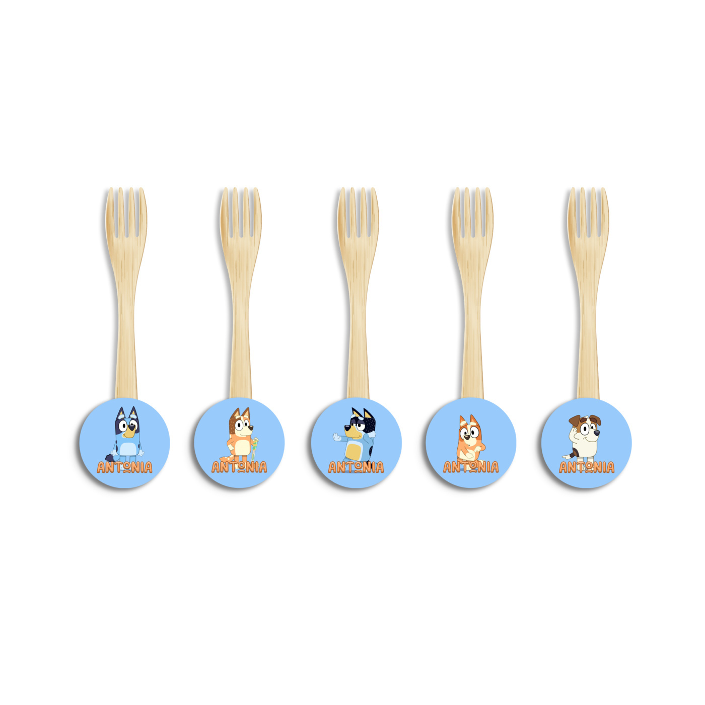 Ξύλινα Πιρουνάκια με όνομα Bluey για τον θεματικό μπουφέ σας.