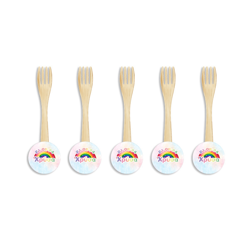 Ξύλινα Πιρουνάκια με όνομα Rainbow για τον θεματικό μπουφέ σας.