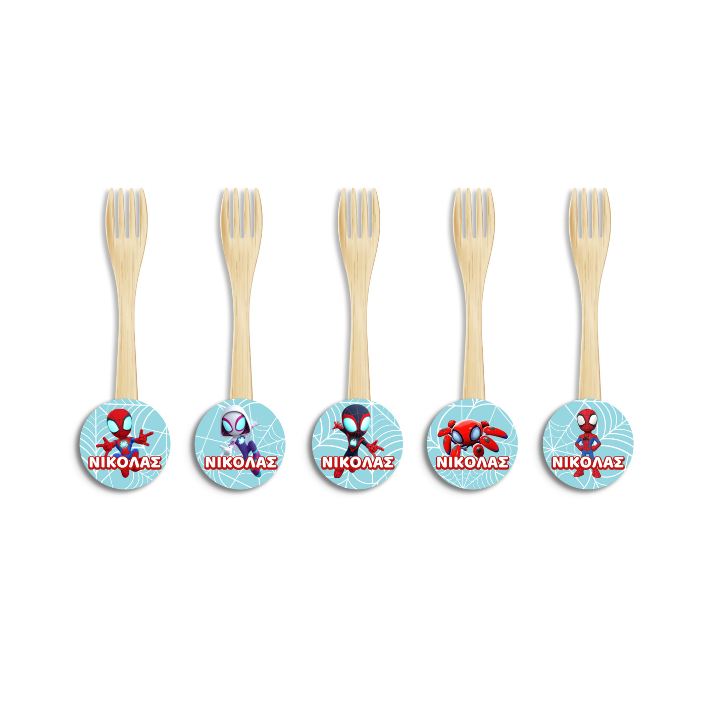Ξύλινα Πιρουνάκια με όνομα Spidey για τον θεματικό μπουφέ σας.