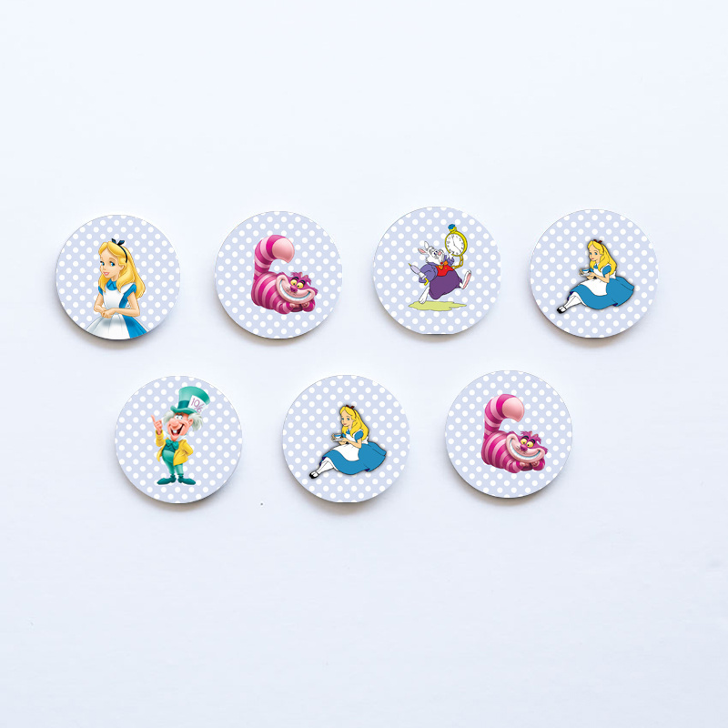 Κονκάρδες με θέμα την Αλίκη στη Χώρα των Θαυμάτων, ιδανικές για μπομπονιέρα, για δωράκι στους καλεσμένους ή για να διακοσμήσετε με αυτές τα αγαπημένα σας αντικείμενα!