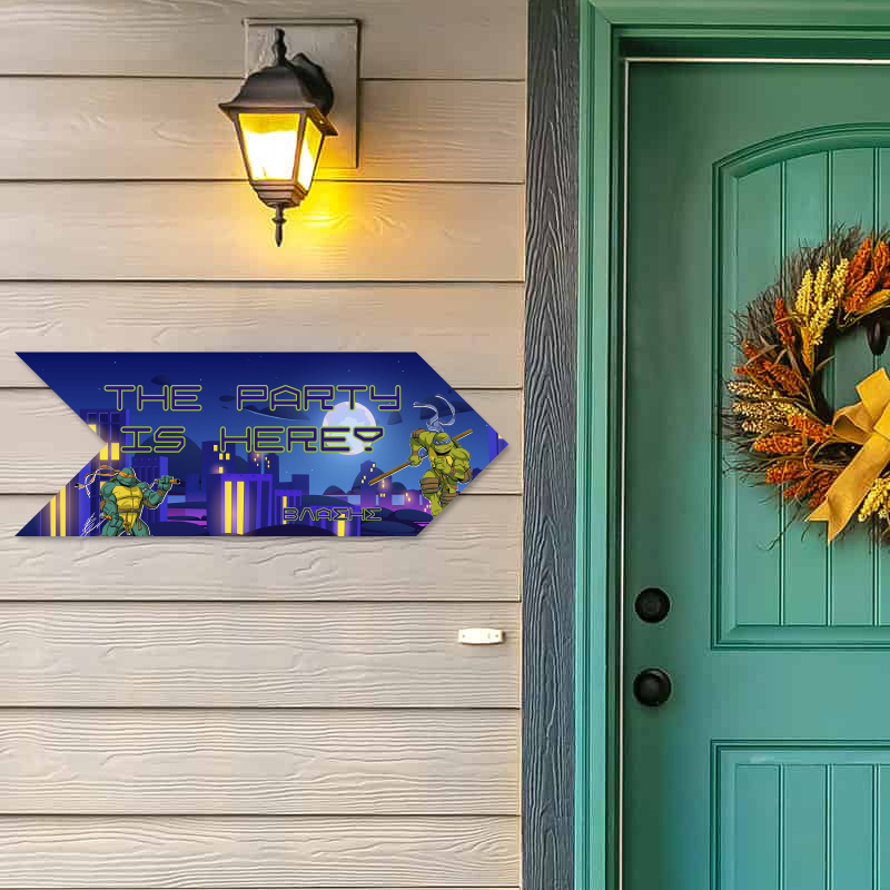 Υπέροχη ξύλινη πινακίδα Χελωνονιντζάκια, προσαρμοσμένη με το όνομα του παιδιού, διαστάσεων 40cm x 15cm.