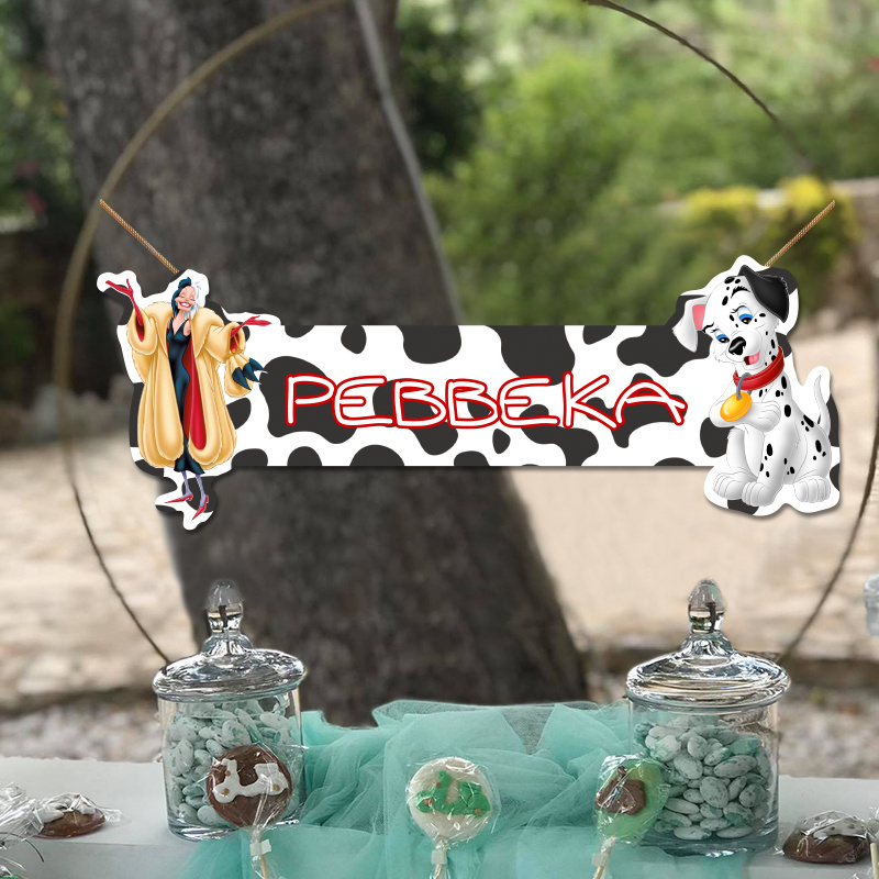 Ξύλινο κοπτικό 101 Σκυλάκια Δαλματίας, με το όνομά του παιδιού κατάλληλο για την διακόσμηση του μπουφέ, του candy bar ή του τραπεζιού