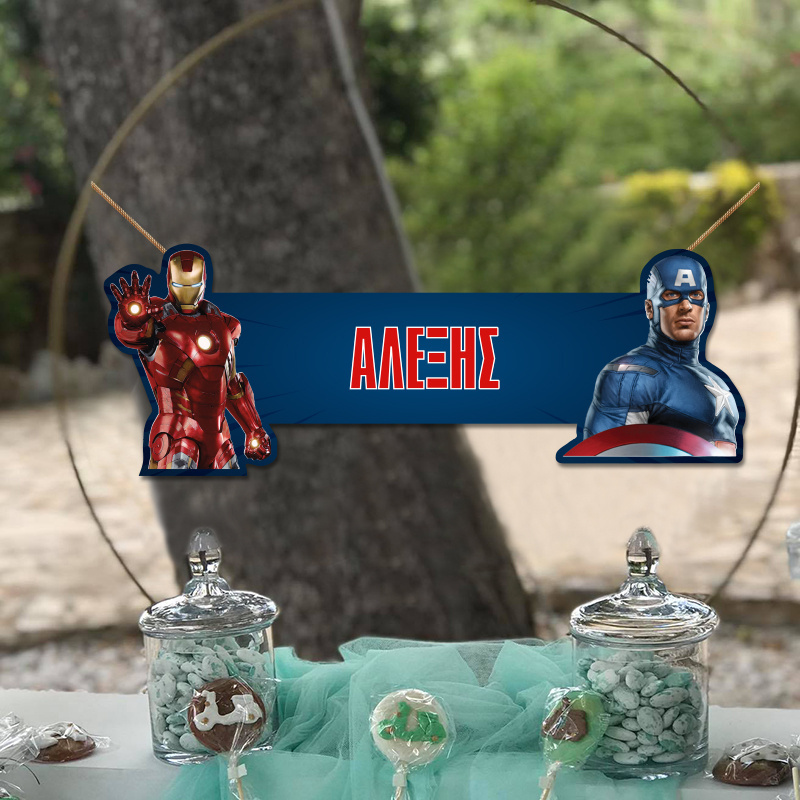 Ξύλινο κοπτικό Avengers, με το όνομά του παιδιού κατάλληλο για την διακόσμηση του μπουφέ, του candy bar ή του τραπεζιού