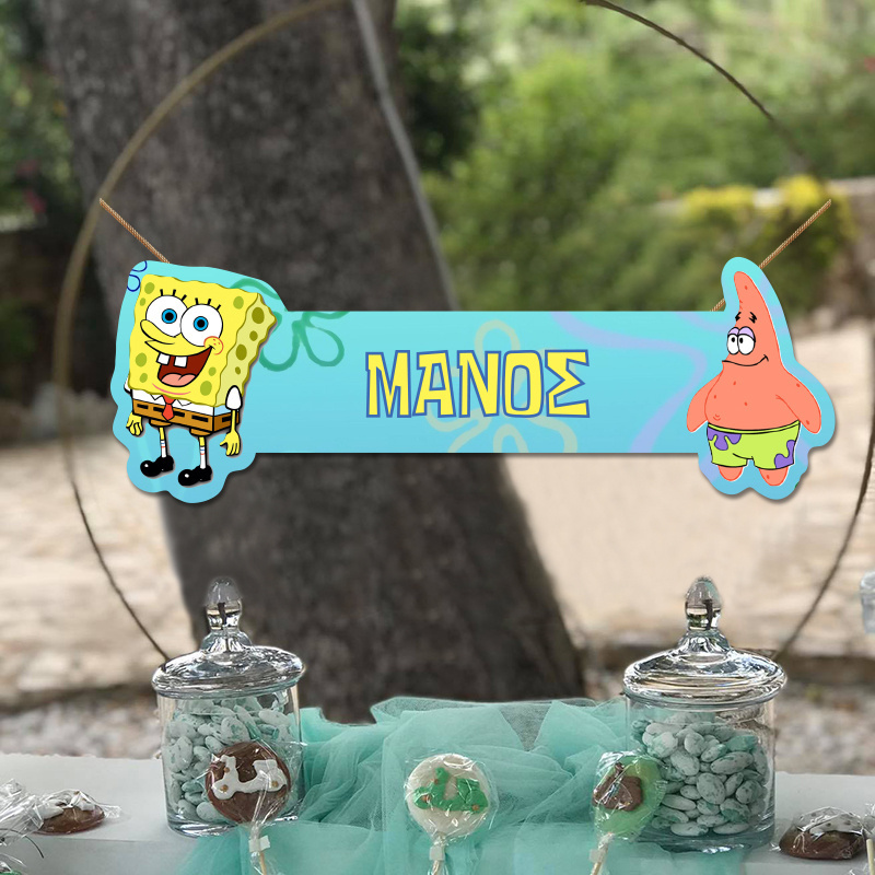 Ξύλινο κοπτικό Μπομπ Σφουγγαράκης, με το όνομά του παιδιού κατάλληλο για την διακόσμηση του μπουφέ, του candy bar ή του τραπεζιού