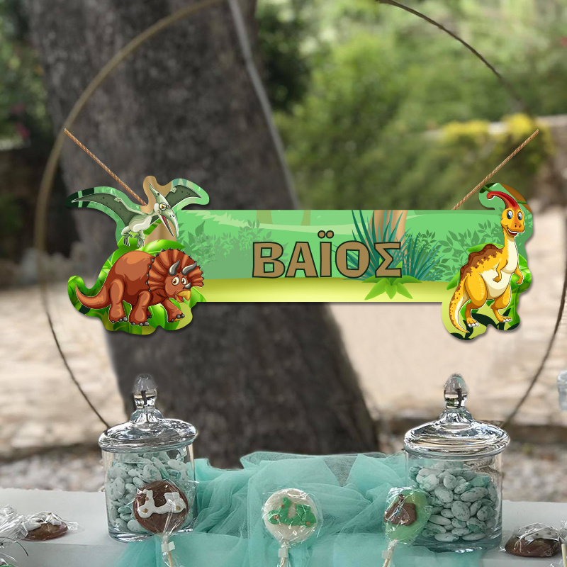 Ξύλινο κοπτικό Δεινόσαυροι, με το όνομά του παιδιού κατάλληλο για την διακόσμηση του μπουφέ, του candy bar ή του τραπεζιού