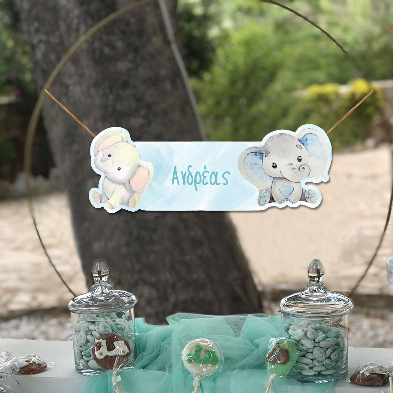 Ξύλινο κοπτικό Ελεφαντάκι, με το όνομά του παιδιού κατάλληλο για την διακόσμηση του μπουφέ, του candy bar ή του τραπεζιού