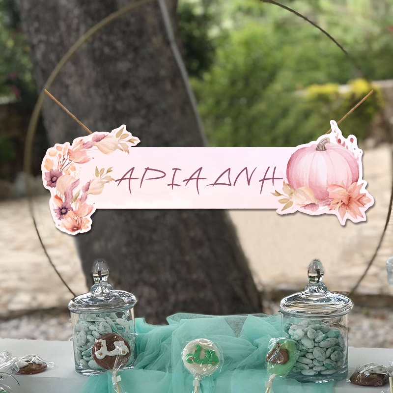 Ξύλινο κοπτικό Κολοκύθα, με το όνομά του παιδιού κατάλληλο για την διακόσμηση του μπουφέ, του candy bar ή του τραπεζιού