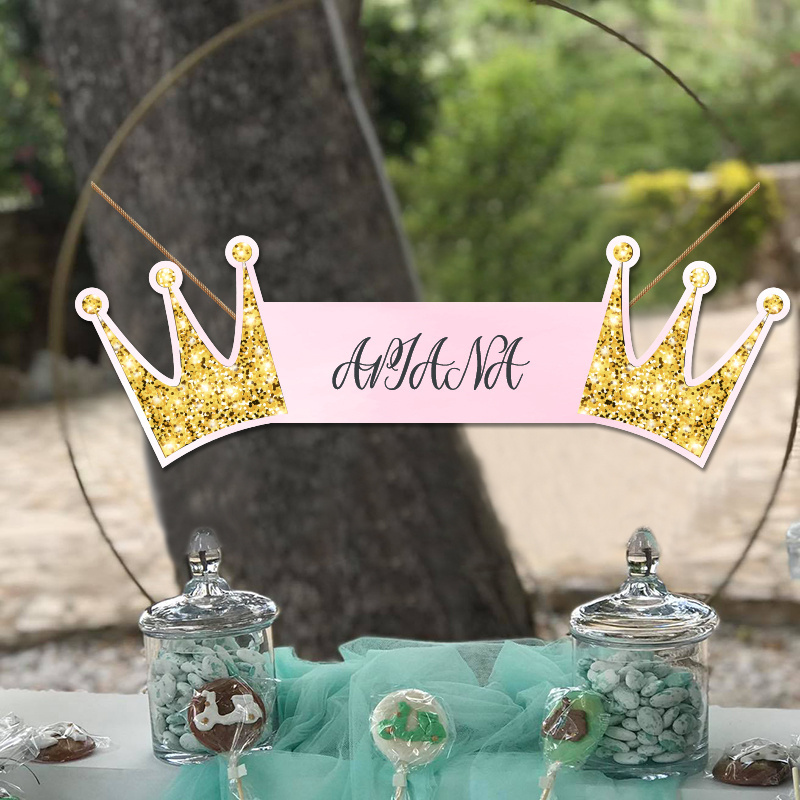 Ξύλινο κοπτικό Κορώνα, με το όνομά του παιδιού κατάλληλο για την διακόσμηση του μπουφέ, του candy bar ή του τραπεζιού