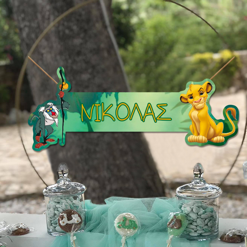 Ξύλινο κοπτικό Lion King, με το όνομά του παιδιού κατάλληλο για την διακόσμηση του μπουφέ, του candy bar ή του τραπεζιού