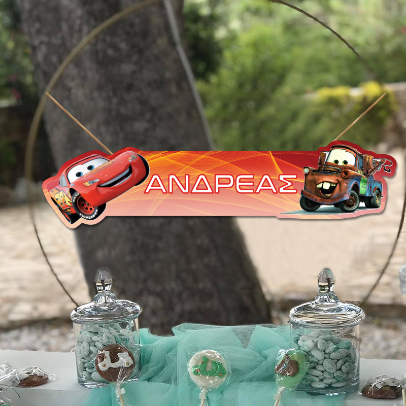 Ξύλινο κοπτικό McQueen, με το όνομά του παιδιού κατάλληλο για την διακόσμηση του μπουφέ, του candy bar ή του τραπεζιού