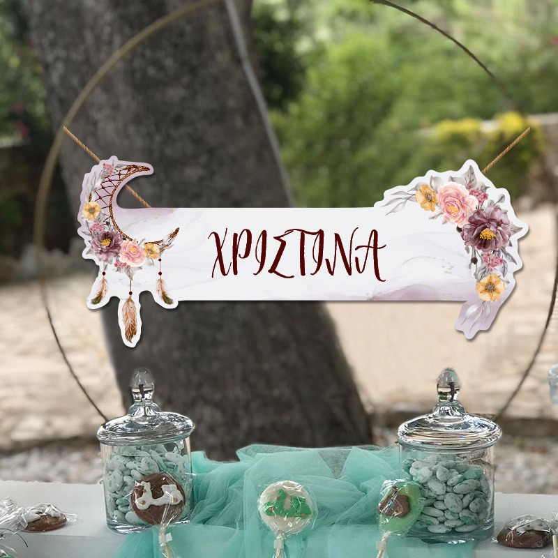 Ξύλινο κοπτικό Ονειροπαγίδα Κορίτσι, με το όνομά του παιδιού κατάλληλο για την διακόσμηση του μπουφέ, του candy bar ή του τραπεζιού