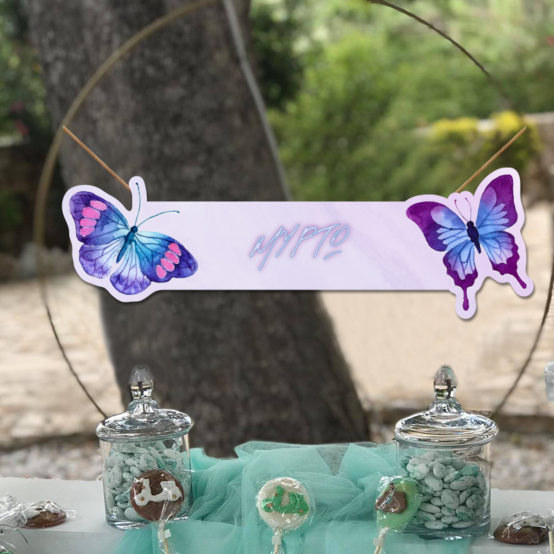 Ξύλινο κοπτικό Πεταλούδες, με το όνομά του παιδιού κατάλληλο για την διακόσμηση του μπουφέ, του candy bar ή του τραπεζιού