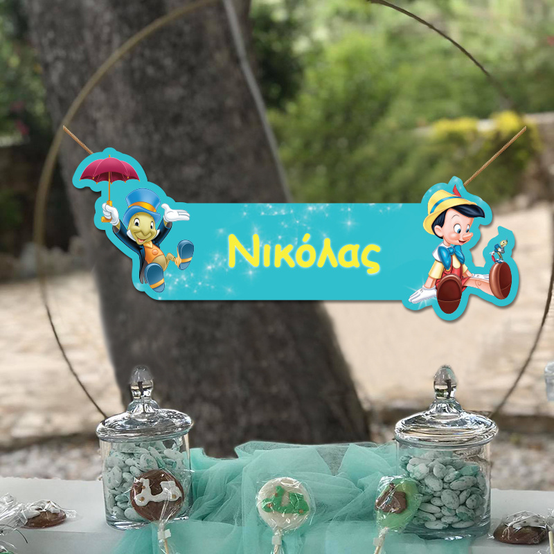 Ξύλινο κοπτικό Πινόκιο, με το όνομά του παιδιού κατάλληλο για την διακόσμηση του μπουφέ, του candy bar ή του τραπεζιού