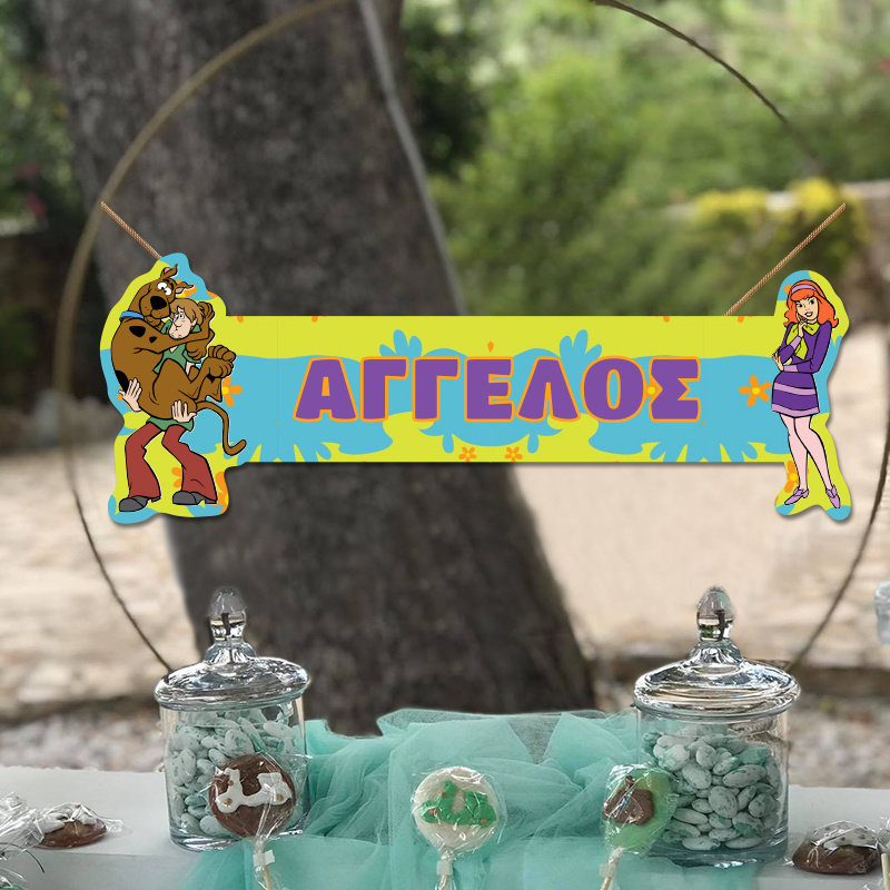 Ξύλινο κοπτικό Scooby-Doo, με το όνομά του παιδιού κατάλληλο για την διακόσμηση του μπουφέ, του candy bar ή του τραπεζιού