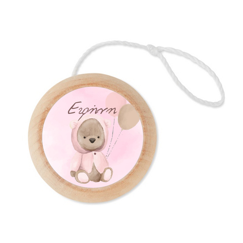Γιο-Γιο από Ξύλο Αρκουδάκι για Κορίτσι με το όνομα του παιδιού με αυτοκόλλητο και στις δύο πλευρές κατάλληλο για δωράκι η μπομπονιέρα βάπτισης.