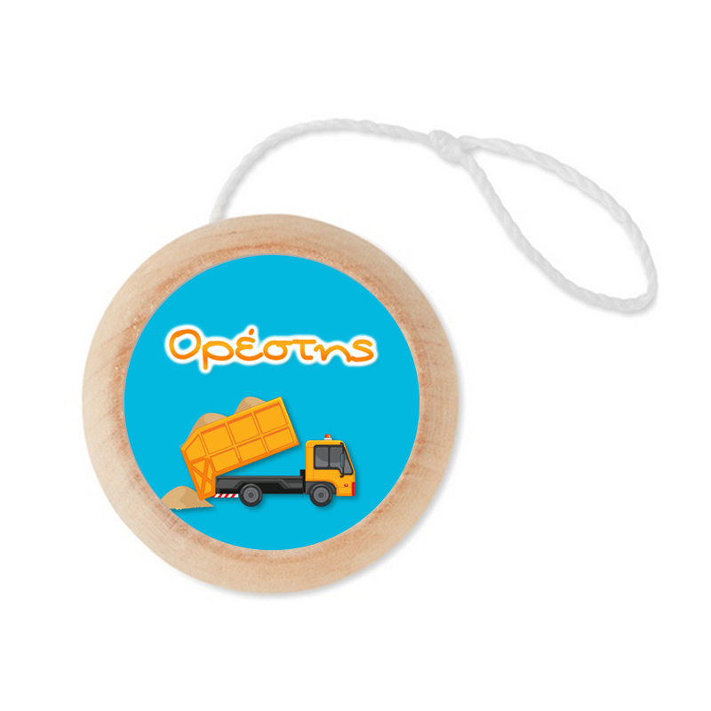 Γιο-Γιο από Ξύλο Εργοτάξιο με το όνομα του παιδιού με αυτοκόλλητο και στις δύο πλευρές κατάλληλο για δωράκι η μπομπονιέρα βάπτισης.