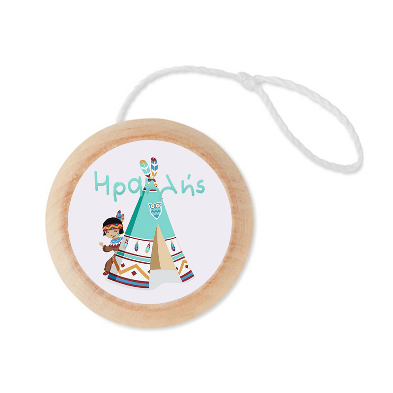 Γιο-Γιο από Ξύλο Ινδιάνος με το όνομα του παιδιού με αυτοκόλλητο και στις δύο πλευρές κατάλληλο για δωράκι η μπομπονιέρα βάπτισης.