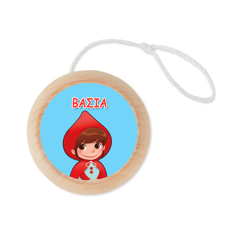 Γιο-Γιο από Ξύλο Κοκκινοσκουφίτσα με το όνομα του παιδιού με αυτοκόλλητο και στις δύο πλευρές κατάλληλο για δωράκι η μπομπονιέρα βάπτισης.
