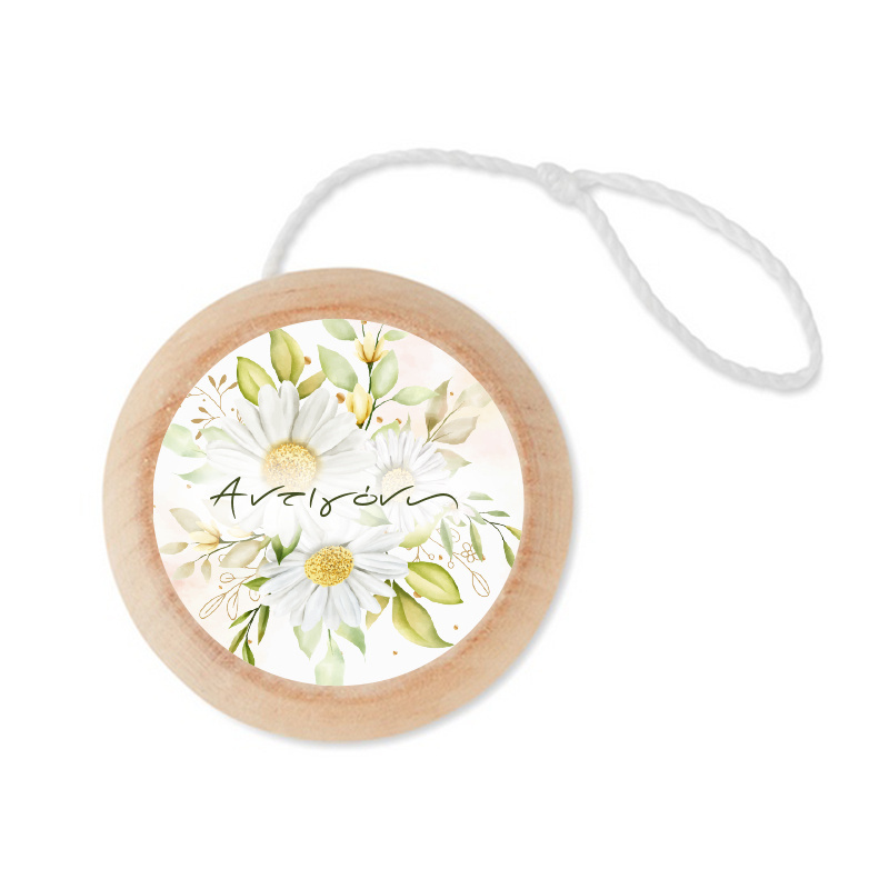 Γιο-Γιο από Ξύλο Μαργαρίτα με το όνομα του παιδιού με αυτοκόλλητο και στις δύο πλευρές κατάλληλο για δωράκι η μπομπονιέρα βάπτισης.